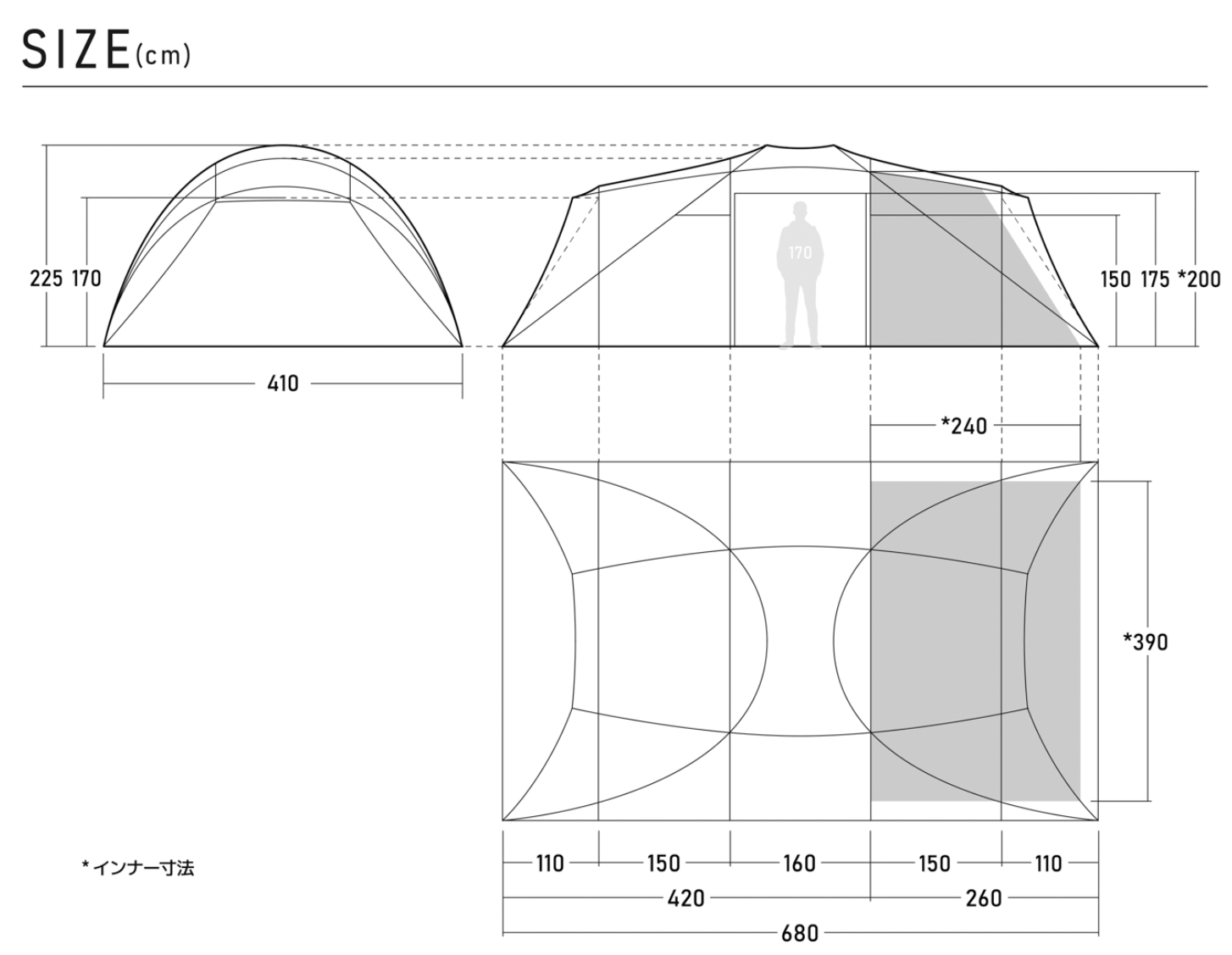 SPEC フライシート設営時:約 W410×D680×H225 cm 収納サイズ:約 W70×D45×H35 cm 重量:約 30.5kg+ペグ・ハンマーセット